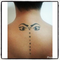 Mom already had a tattoo done of her name in Thai in Thailand, Pattaya. Adding an airbrushed pair of eyes right at the top completes her whole tattoo.